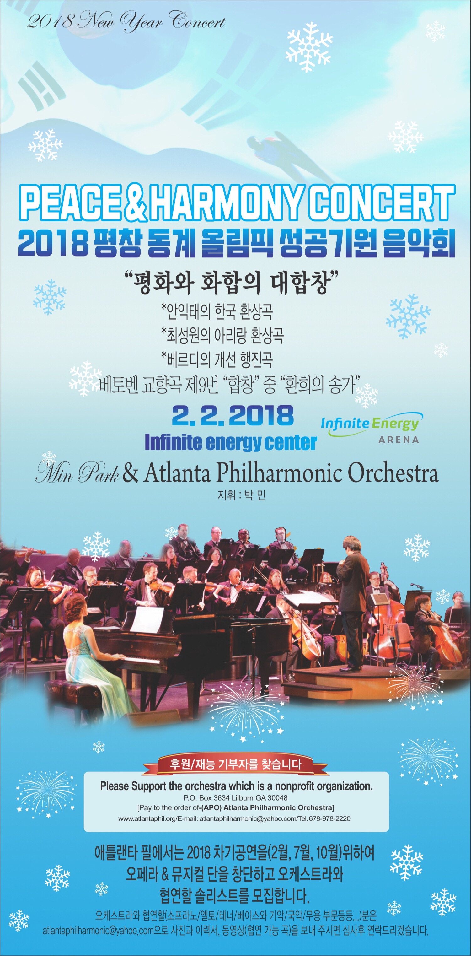 2018 New Year Concert- Peace & Harmony Concert 평창 동계올림픽 성공기원 음악회 Please send your resume/profile with a video clip showing your performance if you would like to joining us at concerts in 2018 to atlantaphilharmonic@yahoo.com
