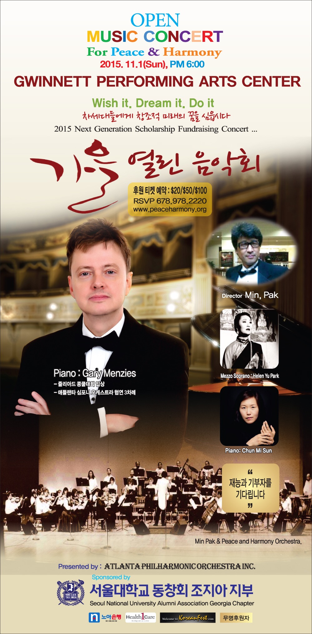 본 음악회의 취지와 목적, 그리고 방향 차세대의 미래를 위한 Wish it, Dream it, And Do it 의 취지로, 애틀란타 필하모닉 오케스트라(주)가Peace & Harmony Orchestra 의 협연으로 가을 열린 음악회가 11월 1일 오후6시에 귀넷 퍼포밍 아트센터에서 열립니다. 특별히 유명한 음악인들의 재능기부와 특별 출연 그리고 이름없이도와주시는 뜻있는 지…