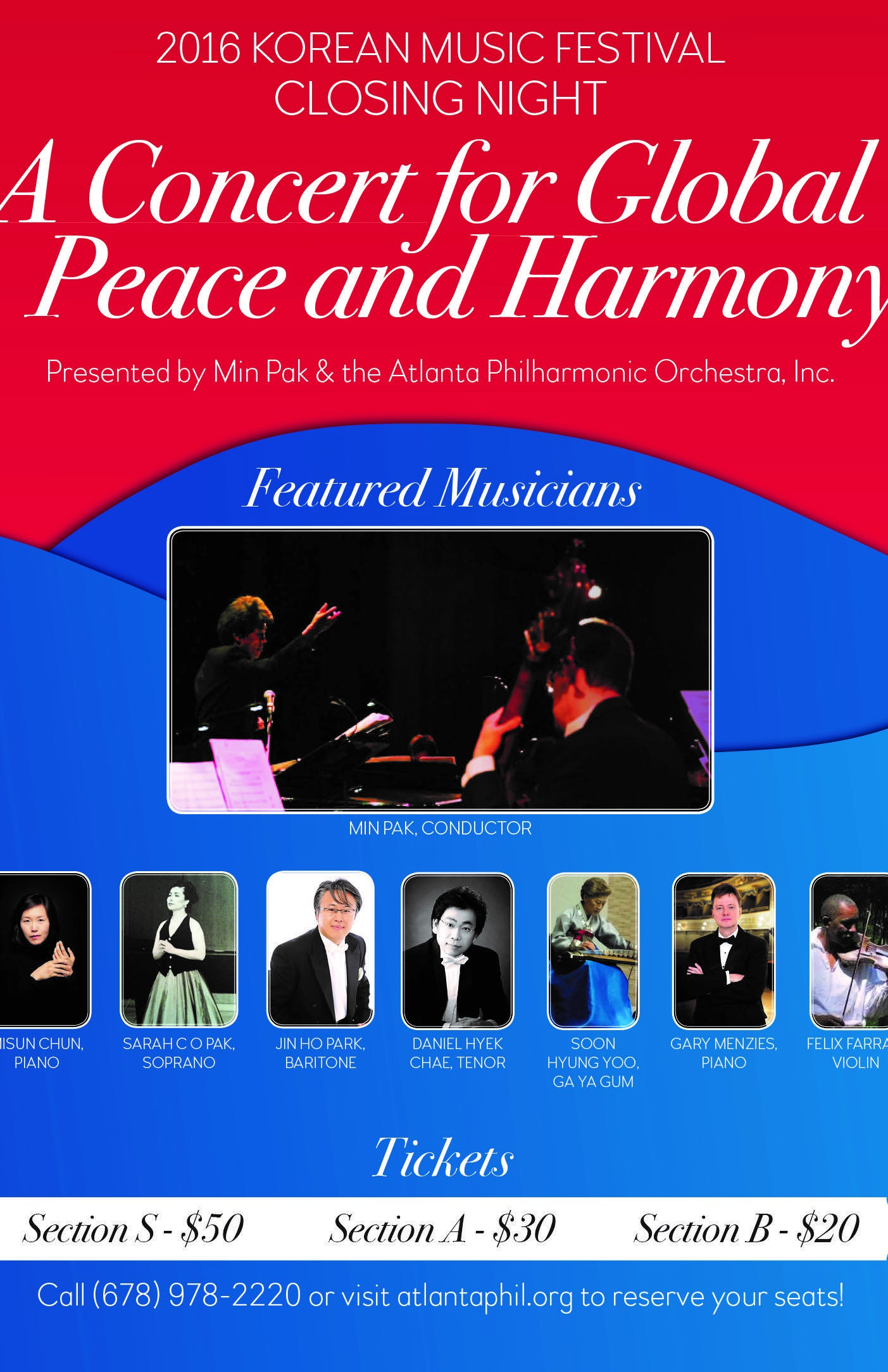 Come Join Us~! The Atlanta Philharmonic Orchestra, Inc. (Non-Profit, 501(c)(3)) and Director Min Pak presents the Global Peace and Harmony Concert, a contribution towards a peaceful world. This concert is specialized in Korean tunes including beautiful Korean folk songs and art songs along with your favorite classical music. All are invited to come and enjoy great music performed by guest virtuosos ranging from singers and pianist to instrumentalists…